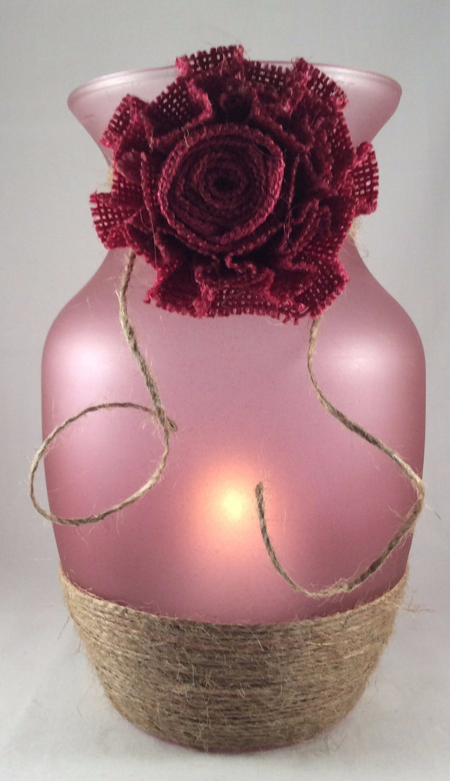 Glass Vase Candle Holder, Frosted Pink Vase with Jute and Burlap Bow