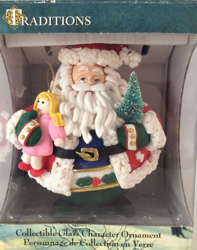 Traditions Glass Character Ball Ornament Santa Clause With Doll & Christmas Tree