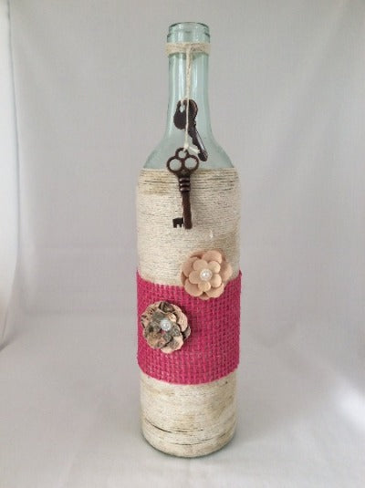 Wine Bottle Vase, Shabby Chic, Paper Flowers and Skeleton keys, Handwrapped with Twine