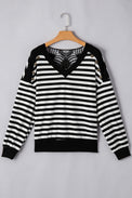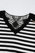 Black Stripe Crochet Hollow-out Back Buttoned Shoulder V Neck Top