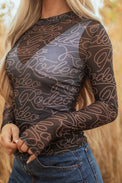 Black Western Rodeo Printed Mock Neck Long Sleeve Mesh Top