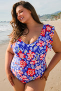 Blue Floral Print Ruffled V Neck High Waist One Piece Swimwear