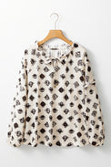 White Printed Split Neck Bubble Sleeve Loose Blouse